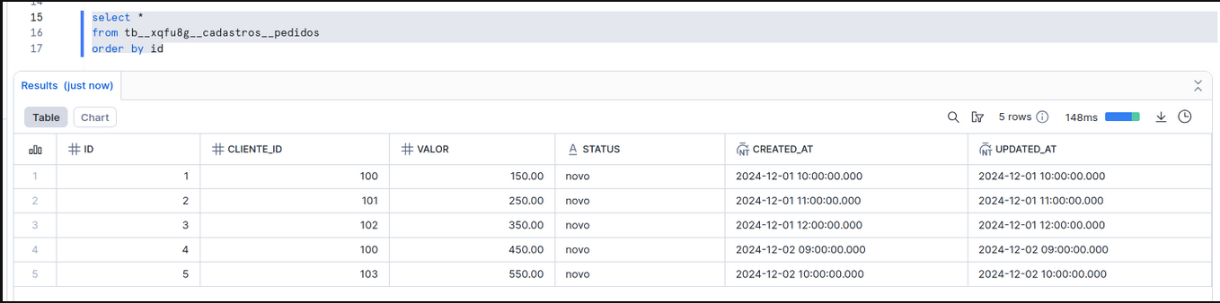 A pipeline sincronizou os 5 registros iniciais da tabela pedidos.
